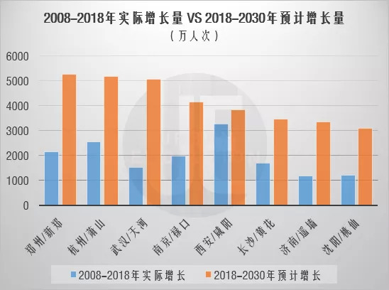 从旅客吞吐量增长绝对值看,除西安外,其余7座城市机场规划的2018-2030年增长人次,远高于其过去10年增长人次,已达到约2倍差距,武汉和济南甚至达到3倍左右。