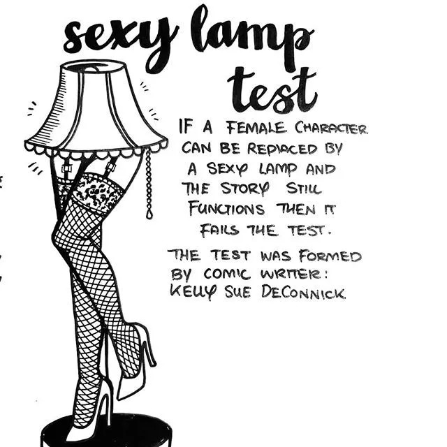 2012年由漫画家凯莉·苏·迪柯尼可(Kelly Sue DeConnick)提出了一个“性感台灯测试”,概括起来很简单,将作品中的女性形象替换成一个性感台灯,如果对于剧情推进没有影响,那么证明这个女性形象的塑造是失败的。