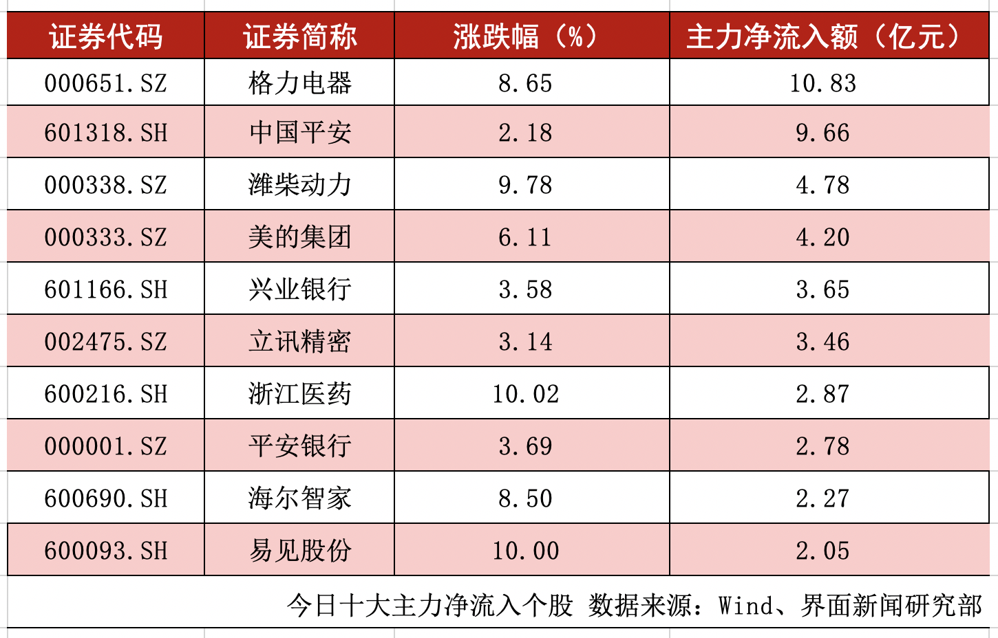 剔除尚未开板的新股及科创板股票,全天沪深两市主力净流入额超过1亿元的个股数量为36个。格力电器(000651.SZ)、中国平安(601318.SH)、潍柴动力(000338.SZ)的主力净流入额位居前三,分别为10.83亿元、9.66亿元、4.78亿元。
