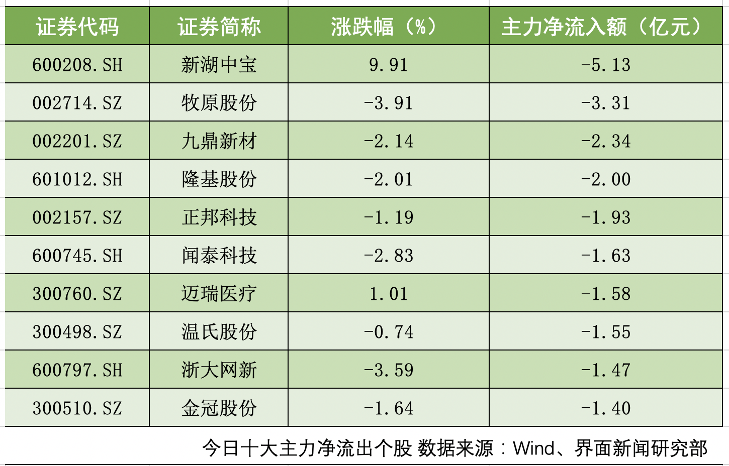 沪深两市共计13只个股主力净流出额超1亿元。新湖中宝(600208.SH)、牧原股份(002714.SZ)、九鼎新材(002201.SZ)主力净流出额位居前三,分别为5.13亿元、3.31亿元、2.34亿元。
