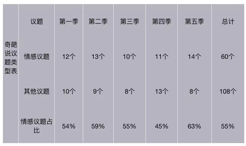 而当我们把前五季的108个辩题(不含被下架敏感辩题和BBKing之争的两人辩题)做统计,会发现单季节目中情感议题通常会超过50%。虽说情感题安全又容易共鸣,但它们的泛化同样是节目的困境。