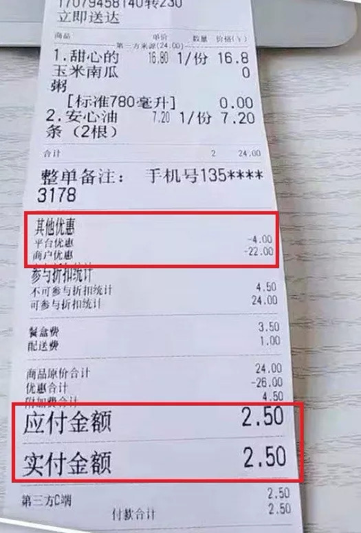平台优惠-4元,商户优惠-22元;餐盒费3.5元,配送费1元,商品原价合计24元,优惠合计26元,应付金额2.5元。一单下来,餐盒费都没挣到!