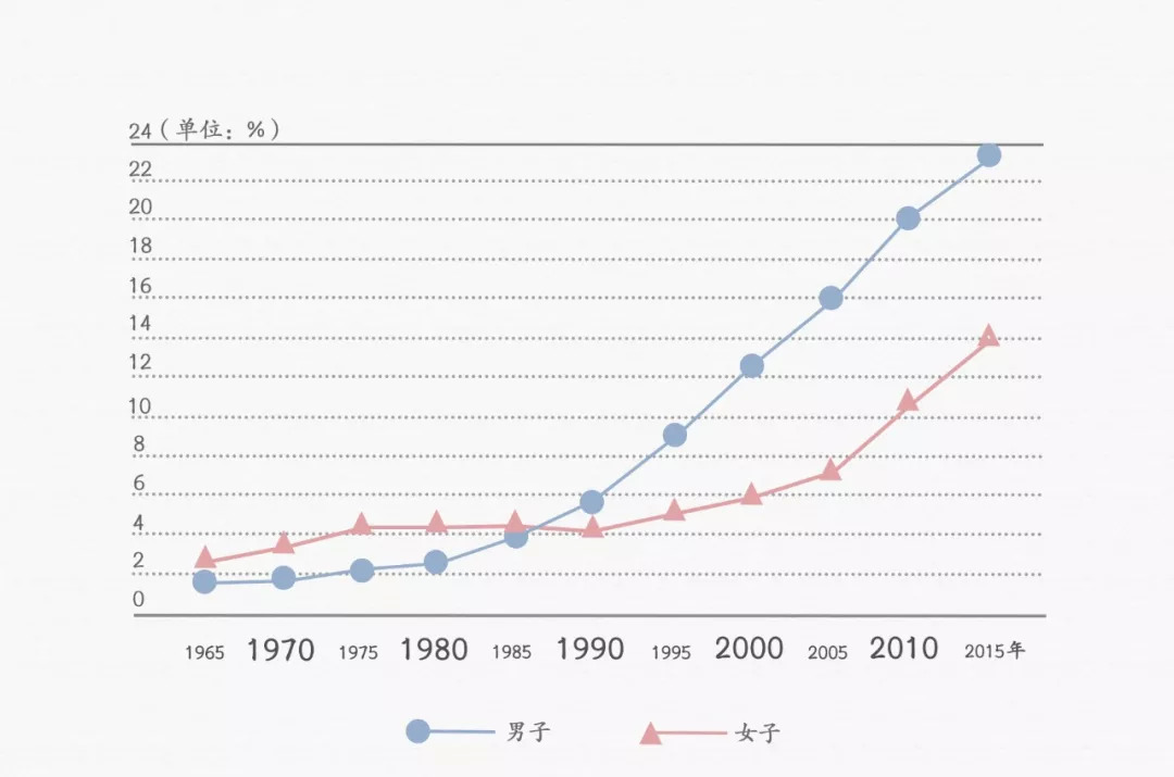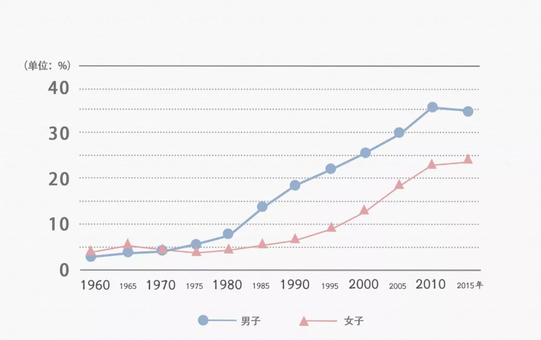 根据日本政府2018年发布的《出生率下降白皮书》显示,1995年,35至39岁女子未婚的比例为10%,到了2015年,这一数字直逼25%;男子同期的变化约为22%至35%。