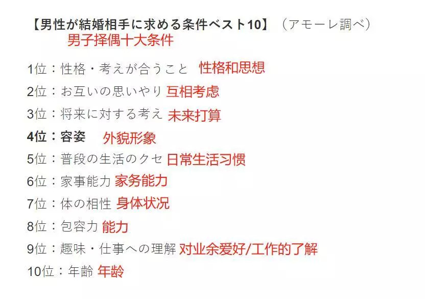 这样的顾虑同样体现在了择偶标准上:相比从前日本女生希望的配偶能够“三高”(高学历、高个头、高收入),如今她们更希望老公能够“三优”(会分担家务、只对女友体贴、帮家里省钱)。
