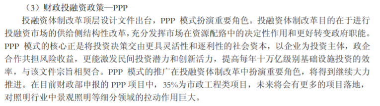 飞乐音响在2016年年报“照明行业及相关政策影响”中提及,财政投融资政策—PPP对行业的影响较大。