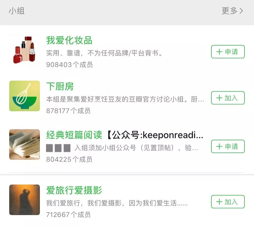 这也给豆瓣带来了大批流量。有90万组员的“我爱化妆品”、87万组员的“下厨房”、80万组员的“经典短篇阅读”、70万组员的“爱旅行爱摄影”等等,小组早就已经是豆瓣上用户活跃度最高的板块了。截止到今天,豆瓣上累计拥有44万个小组,涵盖了文娱、生活、消费、文化的方方面面。