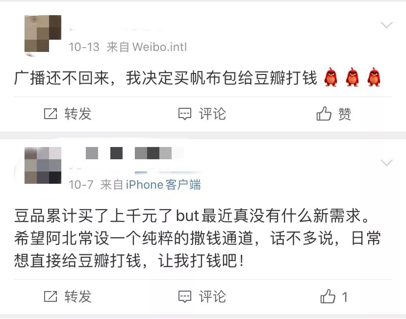 尽管前路漫漫,一些老用户仍在害怕豆瓣消失。最近两年,经常有用户在广播里开玩笑称要给豆瓣打钱、给阿北打钱,甚至一些用户还求着豆瓣多出一些周边,以便能够给予豆瓣更多的支持。10月广播毫无预兆地被关停后,一个豆瓣用户表示,原本他只是习惯借助平台和更多有趣的人对话,如今他却担心起来长时间不注重盈利的豆瓣,最终消失在互联网世界里。
