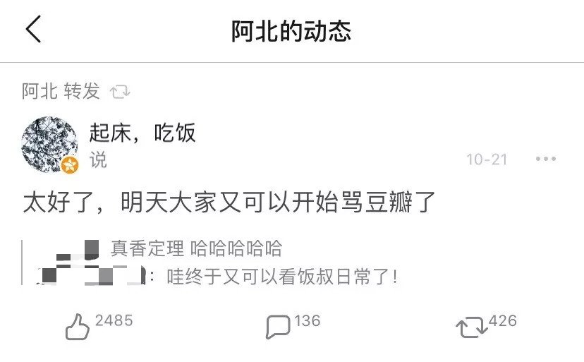 10月20日凌晨,豆瓣广播正式恢复。《四个春天》导演陆庆屹(豆瓣昵称:起床,吃饭)连发了四条广播,其中这条被一年都发不够10条广播的豆瓣CEO阿北转载。