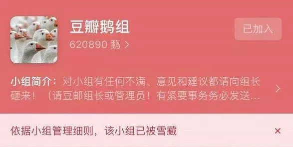 今年5月30日,豆瓣以技术维护为由,将鹅组停用了30天。关于这次禁封的原因,有鹅组用户告诉毒眸可能和某些偶像粉丝间的骂战失控有关,但也有人提出是因为部分讨论涉及到了敏感问题,豆瓣出于自我审查的目的才进行的关停。而此次“严打”并没有改变鹅组的生态,鹅组恢复后的3个多月里,每逢社会热点事件,各种意见依旧如洪水般在组内交织,其中不乏一些辱骂和刻奇。