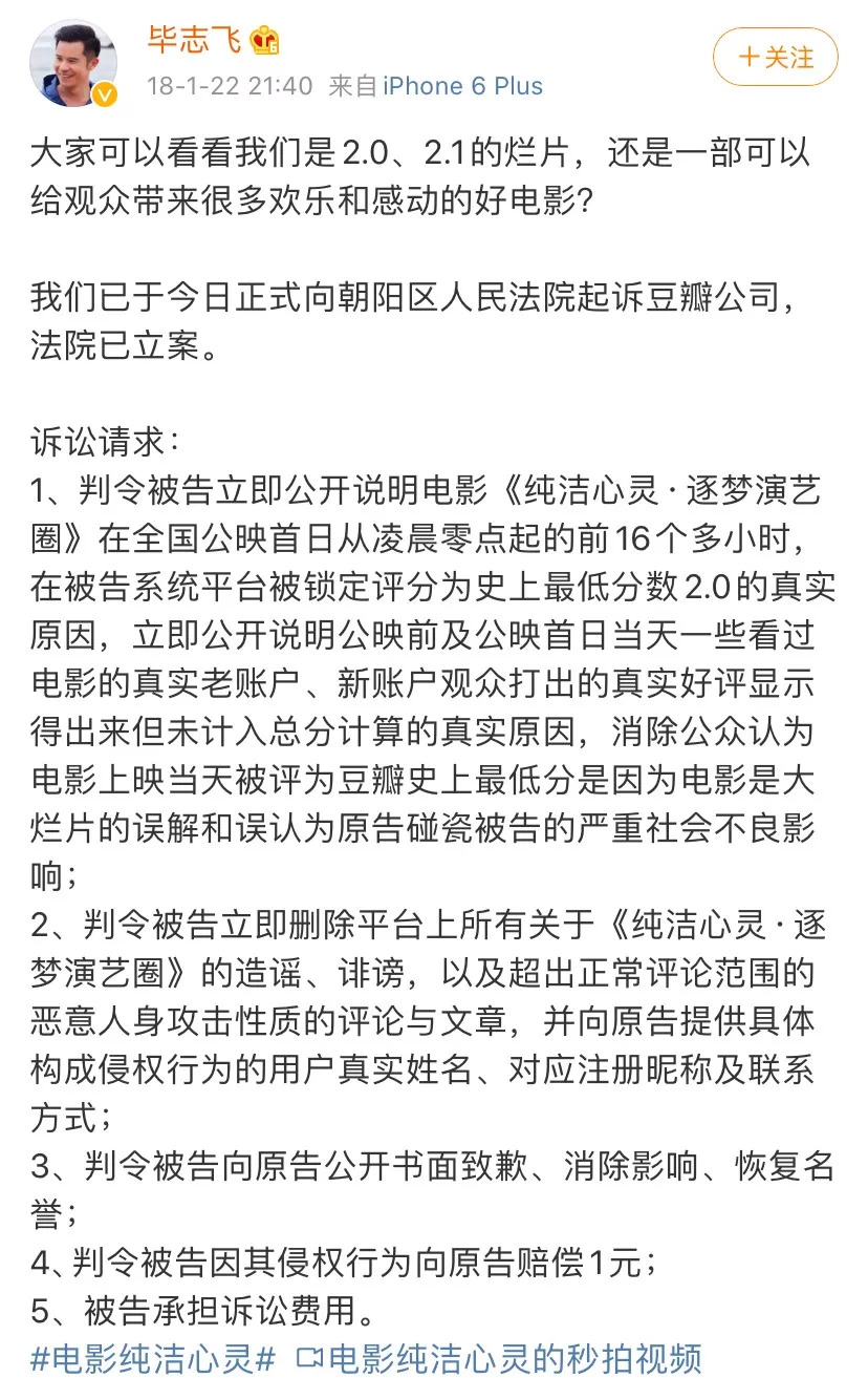 《逐梦演艺圈》导演毕志飞起诉豆瓣