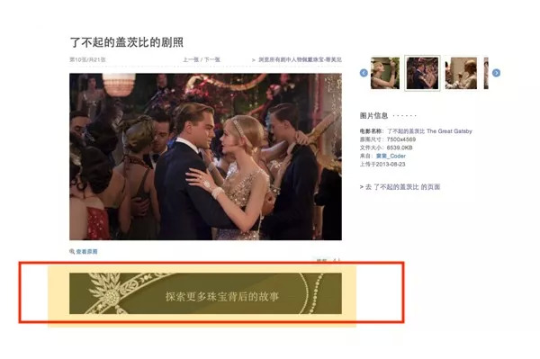 对蒂芙尼的推广,算是豆瓣上线广告平台后的一个经典案例:在电影《了不起的盖茨比》的“预告片和图片”版块中,豆瓣设置了名为《剧中人物佩戴珠宝—蒂芙尼》的相册,里面是片中有关珠宝的截图。而相册下方还有一个低调的banner:“探索更多珠宝背后的故事”,点击则会链接到蒂芙尼的品牌小站。