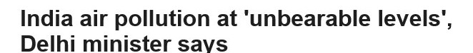 【印度空气污染达“难以忍受的程度”】 印度首都新德里首席部长科基瓦尔(Arvid Kejriwal)称,该国北部的空气污染已经“达到难以忍受的程度”。周日,新德里许多地区的空气质量恶化为“危险”级别,可能导致呼吸道疾病。
