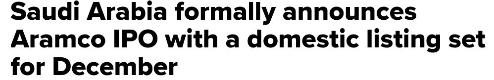 【沙特阿拉伯正式宣布沙特阿美IPO,并将于12月上市】周日,沙特阿拉伯正式启动了国有石油公司沙特阿美的 IPO,宣布将于12月在国内上市。沙特阿美是世界上最大的综合性石油和天然气公司,其IPO可能是有记录以来规模最大的一次。沙特王储萨勒曼对该公司的估值约为20000亿美元,但银行家和公司内部人士则认为,其估值接近15000亿美元。