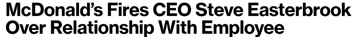 【麦当劳解雇CEO史蒂夫·伊斯特布鲁克】麦当劳解雇了CEO伊斯特布鲁克(Steve Easterbrook),因为他与一名员工在违背公司政策的情况下发生了两厢情愿的关系。