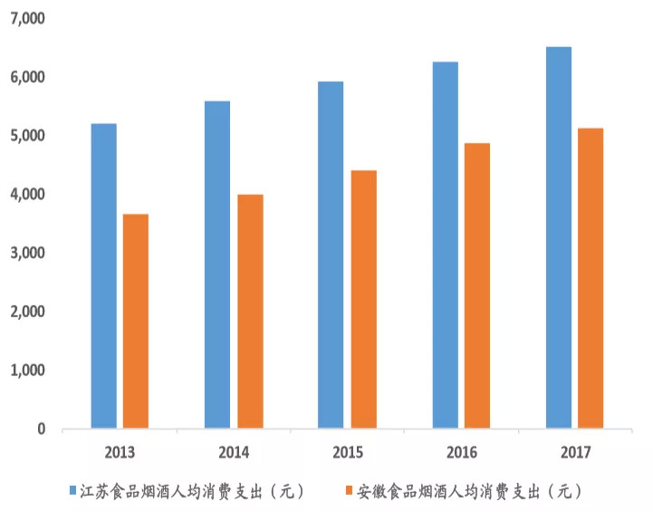 ▲江苏、安徽人均食品烟酒消费支出对比(数据来源:Wind、东北证券)
