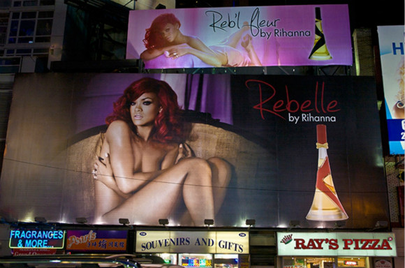 2012年,Rihanna发布了她的香水品牌Rebelle。她将印着只带了项链的自己的照片挂上了时代广场的广告牌。