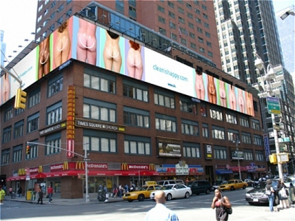 2007年,日本卫浴品牌Toto在时代广场教堂正对面贴出了自己的横幅广告——一群光屁股的女人。再没有比这更直白到位的马桶广告了,但考虑到教堂,Toto不得不在海报中添加了白色图片阻断,免得惹到官司。