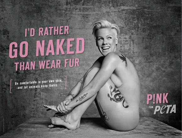 2014年,善待动物组织(PETA)的视频广告在时代广场播放,它用露出肚子的来暗示皮毛对动物的重要性,海报上写着“将羊毛移出你的购物单”。2015年,PETA继续沿用裸露风,歌手Pink为其拍摄躶体广告,称自己即便是光着也不要穿皮草。广告在2月的纽约时装周期间发布。