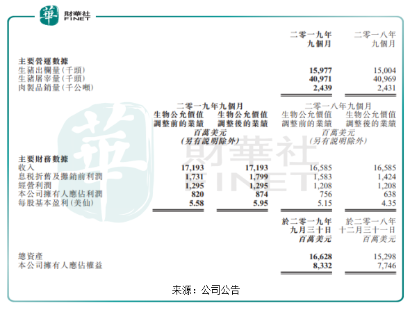 10月28日,万洲国际发布2019年前三季度未经审核综合季度业绩报,从数据上来看,万洲国际前三季度业绩取得良好稳定的增长。截至2019年9月30日止9个月,公司的出栏量1597.7万头,较去年同期增长6.48%,随着出栏量的增长,公司的收入(生物公允价值调整前)为171.93亿元(单位:美元,下同),较去年同期增长3.67%,净利润(生物公允价值调整前)为8.2亿元,较去年同期增长8.5%。
