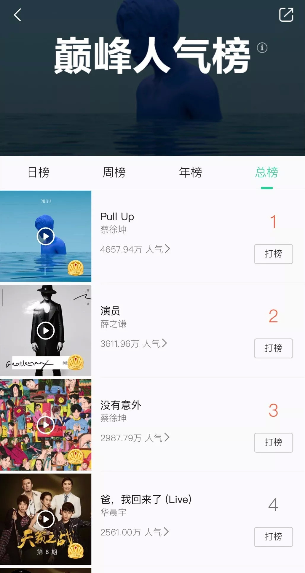 蔡徐坤的粉丝足足花了465万人民币才将他送上总榜第一的位子。图片来源:QQ音乐APP