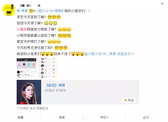 不仅拥有小程序,这家成立资本50万的餐饮公司还拥有追星相关的官方微博账号,日常的工作就是去各家明星超话打卡签到赚脸熟,可惜应者寥寥。