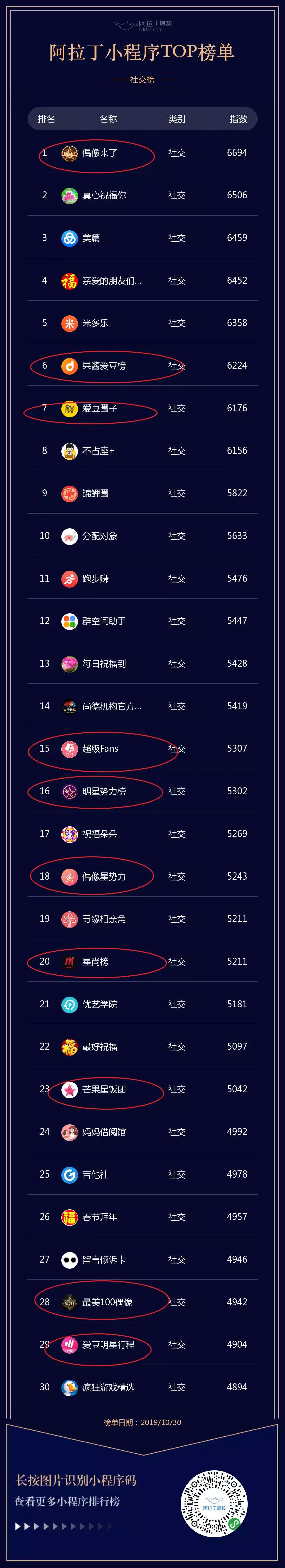 【阿拉丁指数10月30日最活跃的社交小程序TOP30中,有10个都与爱豆打榜相关】