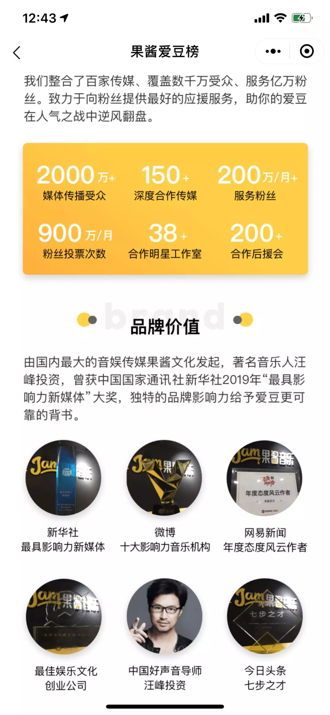 【果酱爱豆榜的控股公司南京果酱文化的投资人里还有音乐人汪峰】 图片来源:果酱爱豆榜小程序