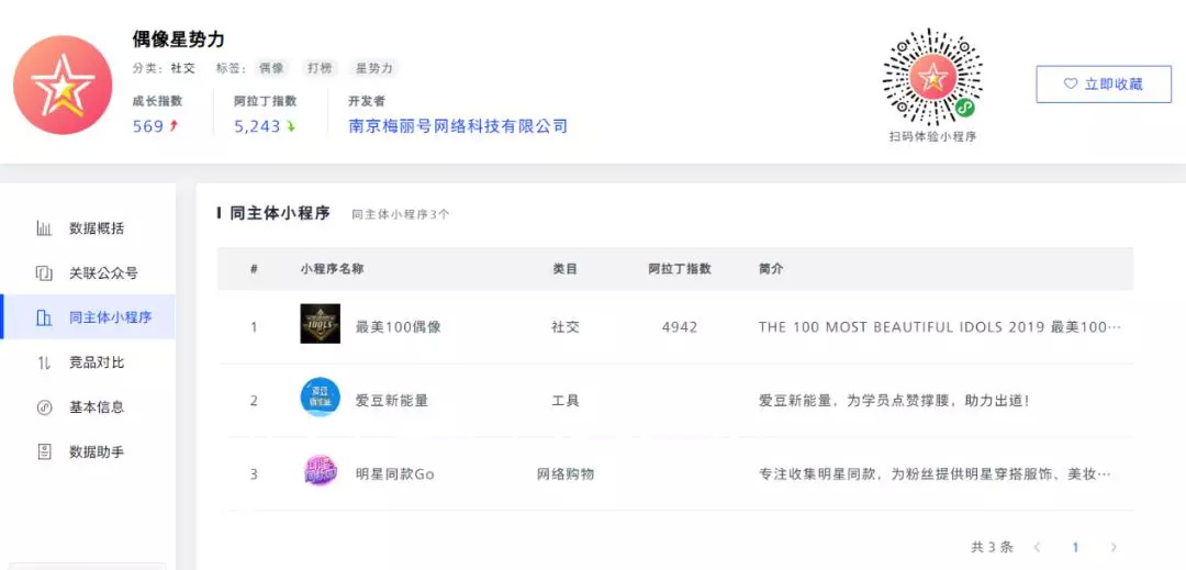 然而这并不代表果酱文化有多清白,小编发现,一个名为 “偶像星势力”的打榜小程序的UI设计与“果酱爱豆榜” 几乎如出一辙。查询得知,其背后的“南京梅丽号网络科技有限公司”还注册了3个小程序,分别是“最美100偶像”、“爱豆新能量”“明星同款go”。其中“爱豆新能量”已经无法正常加载,“明星同款go” 则疑似下架。