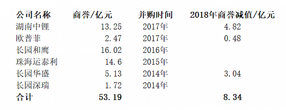 湖南中锂不是唯一一家令人头疼的子公司。在6家商誉过亿的子公司中,3家具有减值迹象,合计计提了8.34亿元商誉减值。截至2019年6月30日,随着长园华盛的处置,长园集团商誉为28.61亿元。