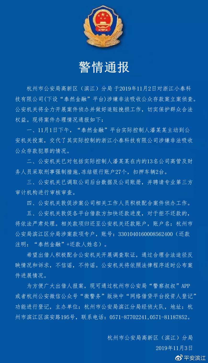 11月3日,杭州市公安局高新区(滨江)分局通过其官方微博“平安滨江”发布通报称,已于11月2日对浙江小泰科技有限公司(下设“泰然金融”平台)涉嫌非法吸收公众存款案立案侦查。