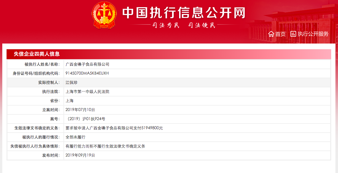 按照中国执行信息公开网信息,2019年9月19日,上海市第一中级人民法院将金嗓子控股集团有限公司(以下简称“金嗓子”,06896.HK)的子公司——金嗓子食品列入失信被执行人名单,失信被执行人行为具体情形是:有履行能力而拒不履行生效法律文书确定义务。