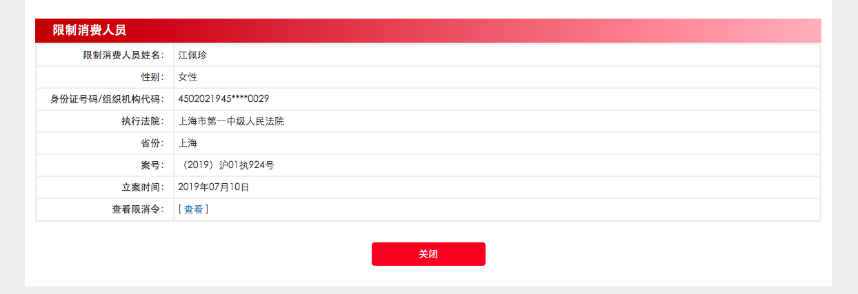按照最高人民法院关于限制被执行人高消费的若干规定,江佩珍被列为“限制消费人员”,将被限制乘坐飞机、列车软卧、轮船二等以上舱位;也被限制在星级以上宾馆、高尔夫球场等场所高消费;同时,不能购买不动产或新建、扩建以及高档装修房屋等。