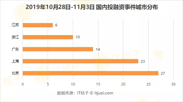 从区域分布来看,北京依然是国内当之无愧的“创投活跃地",上周共发生27起,按照一周7天来计算,平均每天达成 4 笔融资并购交易;上海位居第二,发生 23起;广东居第三,发生 14起。