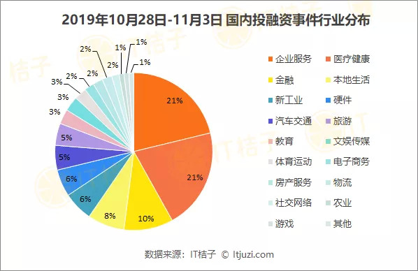从行业分布来看,企业服务以 42 起成为上周国内外发生融资并购事件最多的行业,占比 21%;医疗健康排列第二,发生41起融资并购事件,占比约 21%;金融行业排列第三,发生 20 起融资并购事件,占比 10%。
