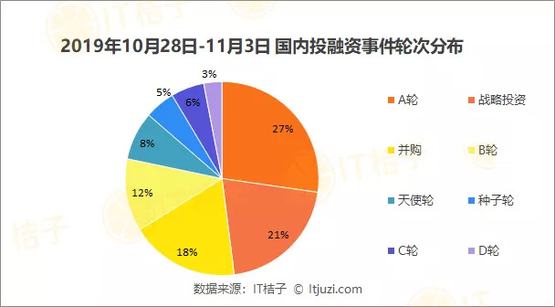 轮次分布来看,上周 A 轮事件占比较大,发生 54 起,占比 27%;战略投资排名第二,发生 41 起,占比 21%;并购事件位列第三,发生 36 起,占比约 18%。