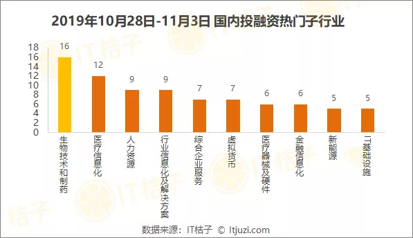 上周最受投资人追捧的子行业分别是生物技术和制药、医疗信息化、人力资源、行业信息化解决方案、综合企业服务、虚拟货币、医疗器械及硬件、金融信息化、新能源、IT基础设施。