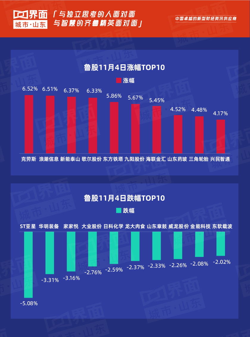 受大盘影响,山东省内沪深股票有96只个股上涨,97只下跌,16只与上一个交易日收盘价持平。青岛克劳斯(600579)11月4日涨幅达6.52%,领跑山东;济南山东黄金(600547)上涨0.47%,总市值突破1000亿元。