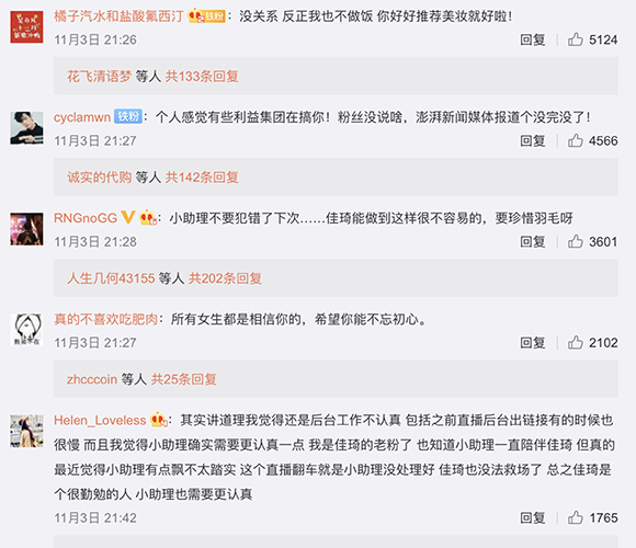 11月3日,李佳琦在其微博转发澎湃新闻的回应视频,并表示欢迎监管。微博评论区里出现的基本都是友善的声音。