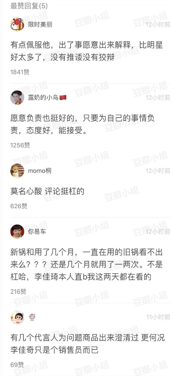 “新锅”、“旧锅”的乌龙事件,还得看消费者是否接受。从豆瓣的高赞评论来看,舆论还是分两边走:一边是称赞李佳琦敢于“背锅”的,一边质疑李佳琦“怎么可能分不清新锅、旧锅”。