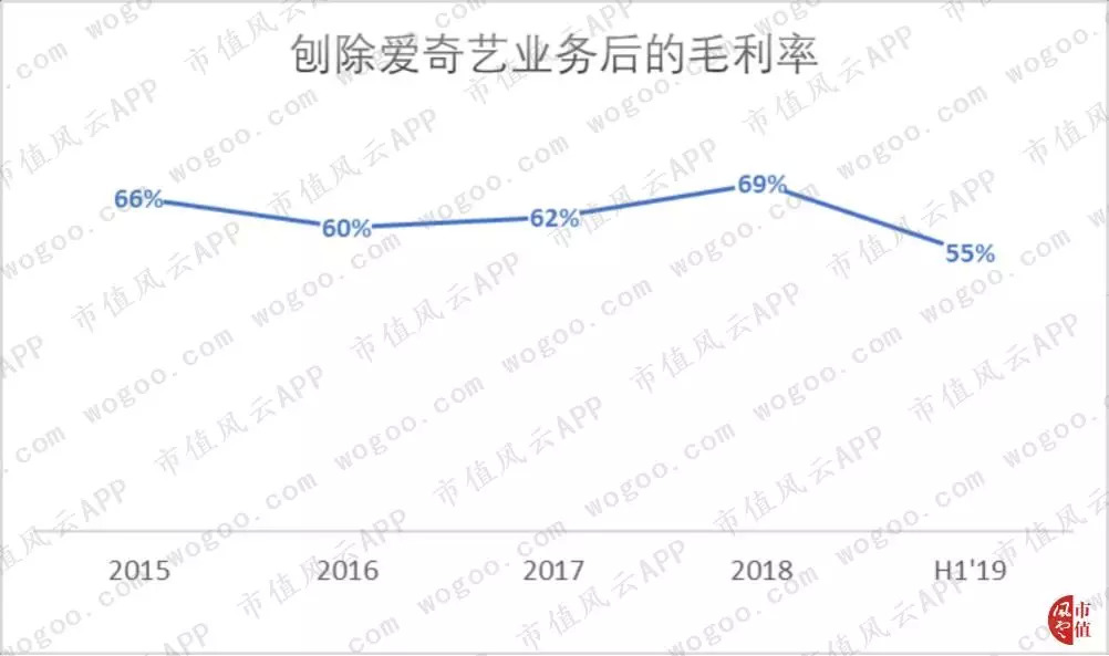风云君测算,如果刨除爱奇艺业务,那么公司的核心业务毛利率过去4年总体还是比较高的,2018年甚至达到当中最高的69%。