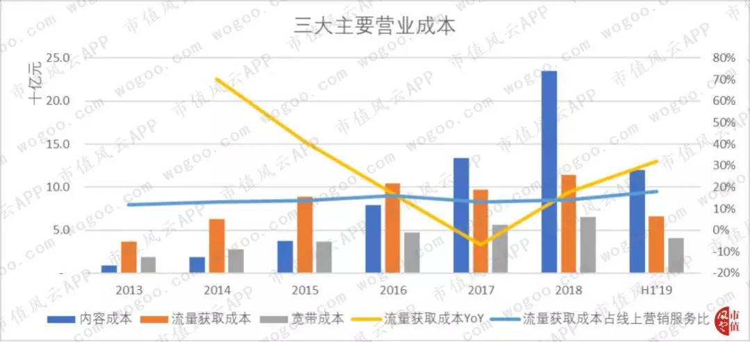 而在营业成本当中,风云君简单讲讲前三大项——内容成本,流量获取成本(“TAC”,Traffic Acquisition Costs),以及宽带成本。