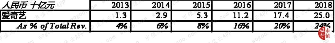 而爱奇艺增速较快,虽处于下降趋势,但2018年仍然维持了44%的增速,使得爱奇艺占公司收入的比重持续上升,2018年达到24%。