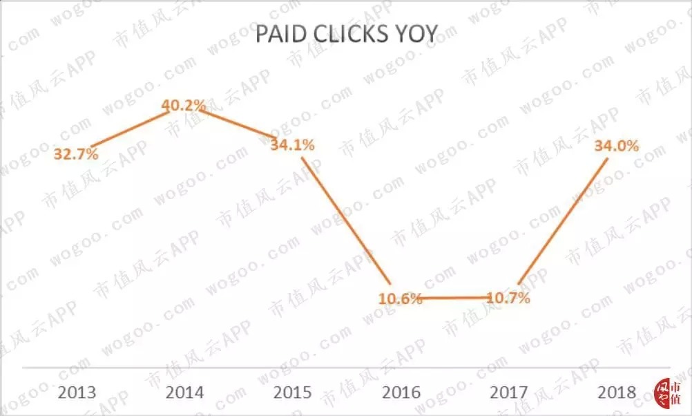 2018年,付费点击量在经历了2016-17这2年的低增长后,恢复到34%的同比增速。