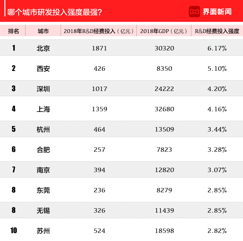 从创新投入方面来看,北京作为首都,拥有着最优秀的人才和科研资源,因此在研发投入的强度上表现最强。千年古都西安在创新投入上非常大方,R&D经费投入强度为5.10%,是全国R&D经费投入强度的两倍多。与去年相比,创新投入榜单中新增了东莞和苏州,研发投入强度分别为2.85%和2.82%。