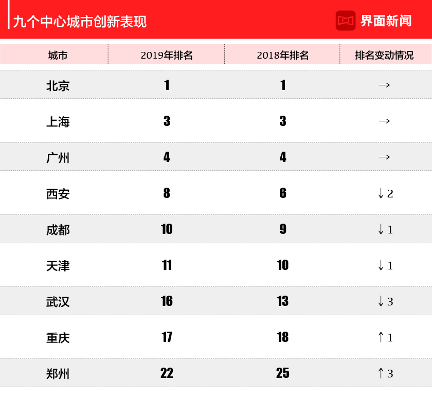 纵观榜单,北京、深圳、上海和广州连续两年占据前四席位,从创新的投入、创新的成果以及创新的主体三个维度来比较,这四个城市都极具创新竞争力。经济大省江苏、广东、浙江入选城市较多,九个国家中心城市北京、上海、广州、西安、成都、天津、武汉、重庆、郑州一一入选。