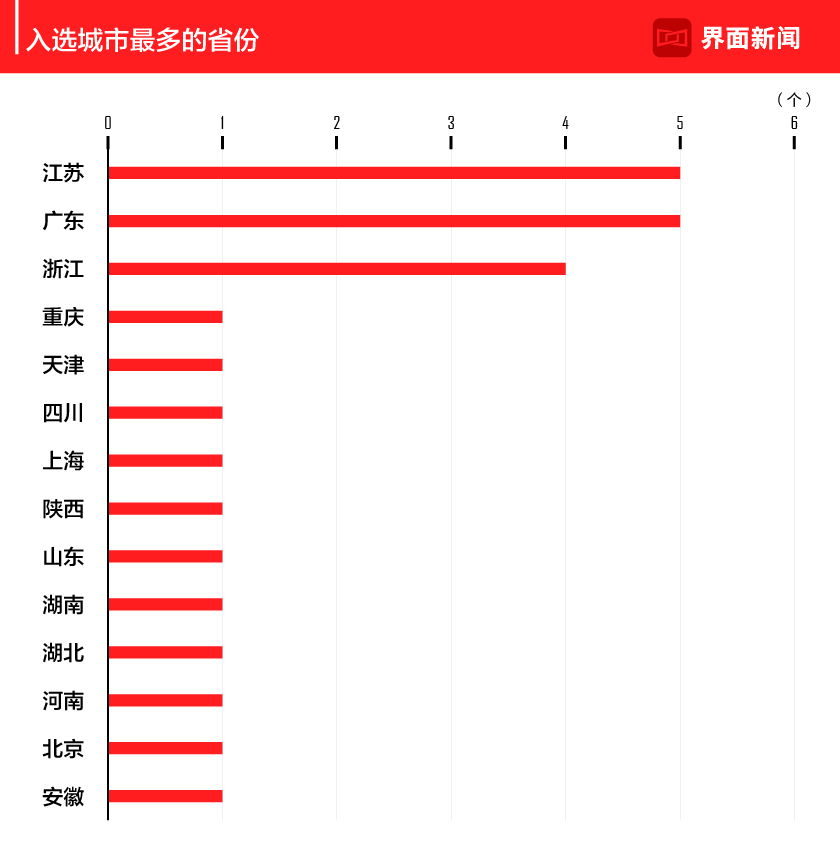 从数量上来说,榜单中的25个城市分布在14个省,其中江苏省和广东省分别有5个城市上榜;浙江省紧随其后,有4个城市入选,分别是杭州、宁波、绍兴和温州。