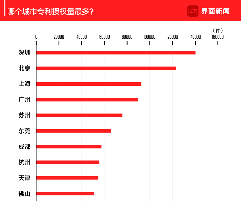 从其构成指标——专利授权量来看,深圳、北京、上海和广州占据前四名,专利授权量分别为14.02万件、12.30万件、9.25万件、8.98万件,分别占全国专利授权总量的5.73%、5.03%、3.78%、3.67%。其中北京发明专利授权量为4.80万件,占北京专利授权量的34.24%。