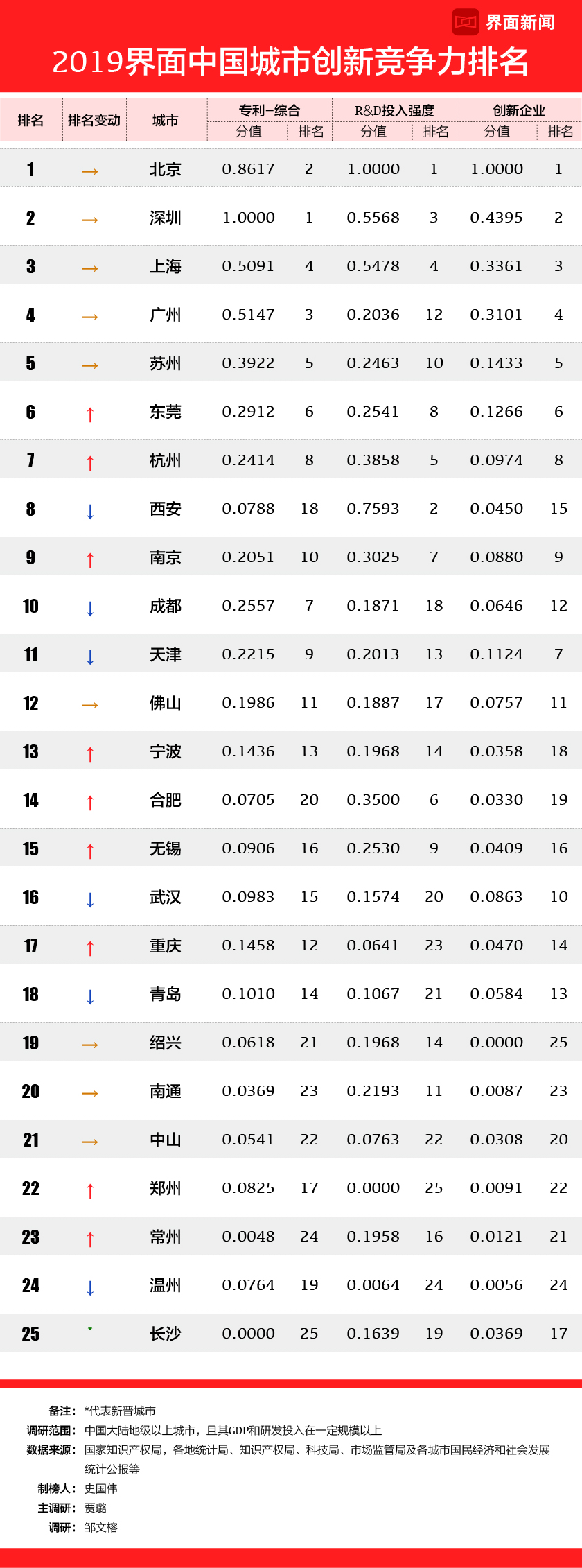 界面第二次发布中国城市创新竞争力排行榜。我们根据各城市的创新投入(R&D经费投入强度)、创新成果(包括年度专利申请量、专利授权量及PCT等)以及创新主体(高新企业、独角兽和科创板公司)三个维度来综合衡量一个城市的创新竞争力。