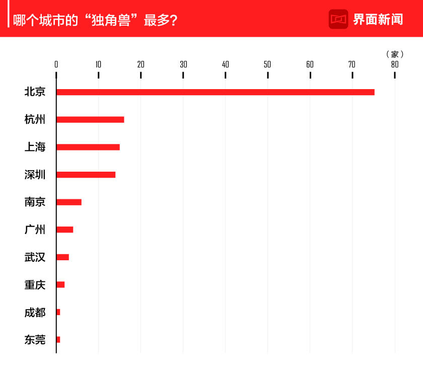 根据2019年恒大研究院发布的《中国独角兽报告2019》显示,中国独角兽企业共有163家。北京除了有“创新之都”、“文明之都”、“历史之都”的称号之外,又有了一个新名字——“独角兽之都”,报告显示北京有75家独角兽企业,排名第一;杭州、上海、深圳分别有16家、15家、14家独角兽企业。