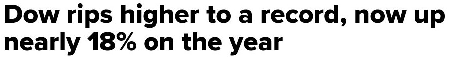 周一的上涨使道琼斯指数今年以来的涨幅接近18%。这将是该指数自2017年上涨28.2%以来最大的年度涨幅。标普500指数在2019年上涨超过22%,有望实现自2013年以来最大的年度涨幅,当时该指数上涨了近30%。纳斯达克指数今年的涨幅也超过了27%。